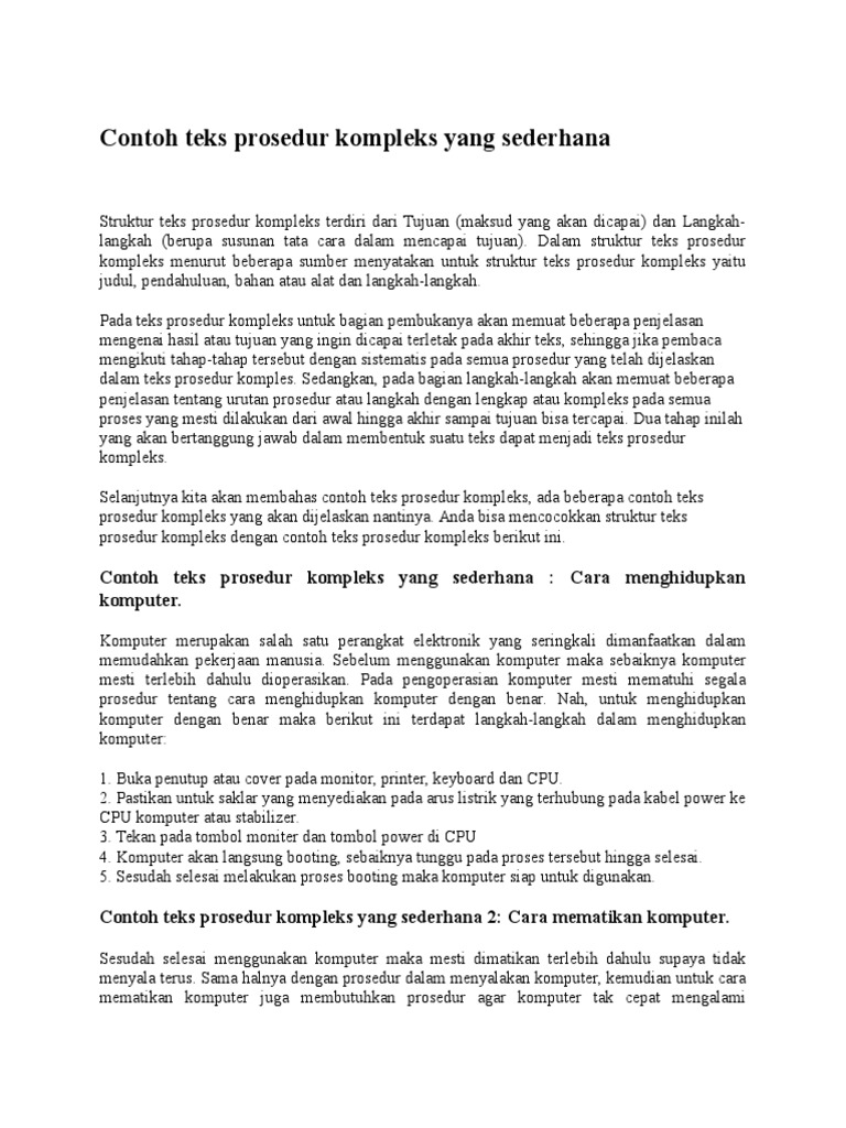 Teks prosedur kompleks umumnya berupa tutorial langkah demi langkah dalam membuat sesuatu. Pada aman ini, contoh teks prosedur lengkap dengan strukturnya disajikan dengan cara yang singkat dan mudah untuk dipahami. Sebelum membahas mengenai teks prosedur, tidak ada salahnya terlebih dahulu kita membahas tentang pengertian prosedur. Beberapa orang takut untuk menyalakan komputer karena mereka takut melakukan kesalahan. Seperti namanya, prosedur itu merupakan langkah dalam menjalankan suatu kegiatan. Contoh teks prosedur beserta struktur dan kaidahnya bisa kamu temukan di sini. Ternyata, teks jenis ini terbagi menjadi dua jenis, yakni teks prosedur kompleks dan simpleks. Bagaimana struktur teks prosedur kompleks itu? Contoh teks prosedur kompleks sederhana. Teks prosedur sederhana merupakan jenis teks prosedur yang paling mudah karena isi teks ini sangat sederhana dan hanya terdiri dari dua hingga empat langkah saja. Berikut ini contoh teks prosedur sederhana: Cara menggunakan masker wajah yang tepat. Jenis teks bahasa indonesia ini memiliki ciri khas tersendiri untuk membedakannya dengan teks lainnya.